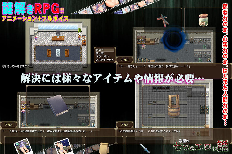七不思議を解決できるアイテムを探したり、作ったりすることでアカネが七不思議に立ち向かいます。